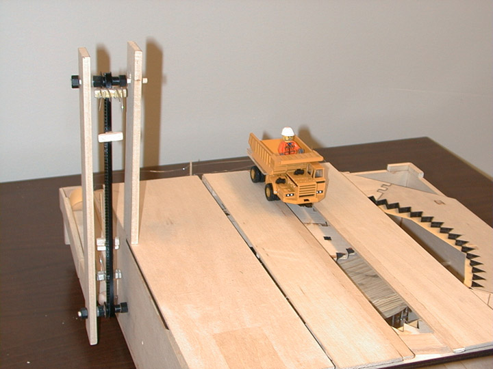 Our project is an automation of a dump truck that moves linearly on top of a box. The system around it is designed to drop a marble in the back, which is carried by the truck and deposited at the end of the box on a person. The marble travels down a rut and is deposited on a rising conveyer belt. The belt takes it to a tower positioned over the dump truck (on the opposite end). Sensors on the track of the dump truck tell when it's below the tower, opening a trap door which deposits the marble in the back for the motion to start again. Other computational additions, which were not completed, include a mechanism for making sound as the truck reverses direction and a mechanism for moving the person (to avoid the marble).