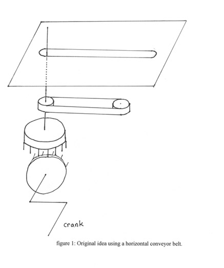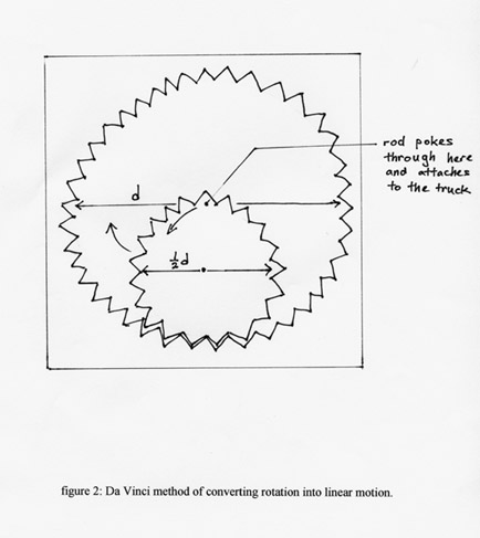 With the basic ideas laid down, we began meshing some of the implementation. The first part would be finding a way to produce reversing linear motion. One idea centered on a horizontal conveyor belt, which would pull the truck back and forth from below a platform (figure 1). At the time, it seemed promising, as it provided the required motion, wouldn't require any sophisticated construction, and was conceptually simple. However, during a class discussion, the voices of experience pointed out several potential flaws involving the tension of the belt, the pulling power it would have, and the general robustness of the system. An interesting alternative was suggested. Leonardo Da Vinci once described linear motion by using two circles. One, with diameter 1/2d, rotates inside the other, with diameter d. A point on the edge of the smaller circle will move in a line through the center of the larger circle (figure 2). The sheer elegance of the mechanism swayed us to drop the conveyor belt idea. We decided we would construct something similar, with a rod protruding from the smaller disk to the truck. The smaller disk would rest on a much larger disk situated below. Using nails, we would construct a pinwheel gear on the lower disk that would enable us to have the crank on the side of the base, as opposed to being below (figure 3). A stop on one side of the base would be used to dump the contents of the truck (figure 4). The other mechanisms seemed simple in comparison, even though this part was relatively straightforward.
