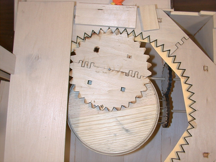 Other small problems included not making the ramps from the dump spot to the lower part of the conveyor belt quite steep enough to begin. The ball would occasionally get stuck, at the L-joint, but this was fixed when we added a curving join made of paper. The prongs on the conveyor belt inflicted significant amounts of pain in the attempt to get them just right, and remained picky in operation. One of our largest problems was with the main Da Vinci mechanism. The lower disk was slightly loose and would tilt during rotation. This put significant pressure on the upper disk and on occasion it would pop out. Inconsistencies in the nails used in the pinwheel gear contributed to the problem as well. We fixed it by straightening the nails, stabilizing the lower disk and adding guides for the upper disk made of paper.