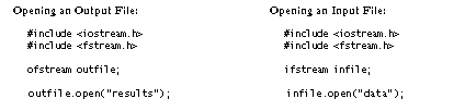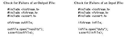 Sometimes, when you open a file, the open operation fails. For example, opening a file for writing can fail if the computer's disk is already full. Opening a file for input will fail if the specified file cannot be found. If the open operation fails, then the stream will be marked as "bad." You may use the name of a stream as a boolean expression to test whether the stream is bad. A bad stream results in a false expression; a device that is still good results in a true expression. Thus, after opening a file, you should check for possible failure. A simple approach uses the assert function (from assert.h ), as shown here:
